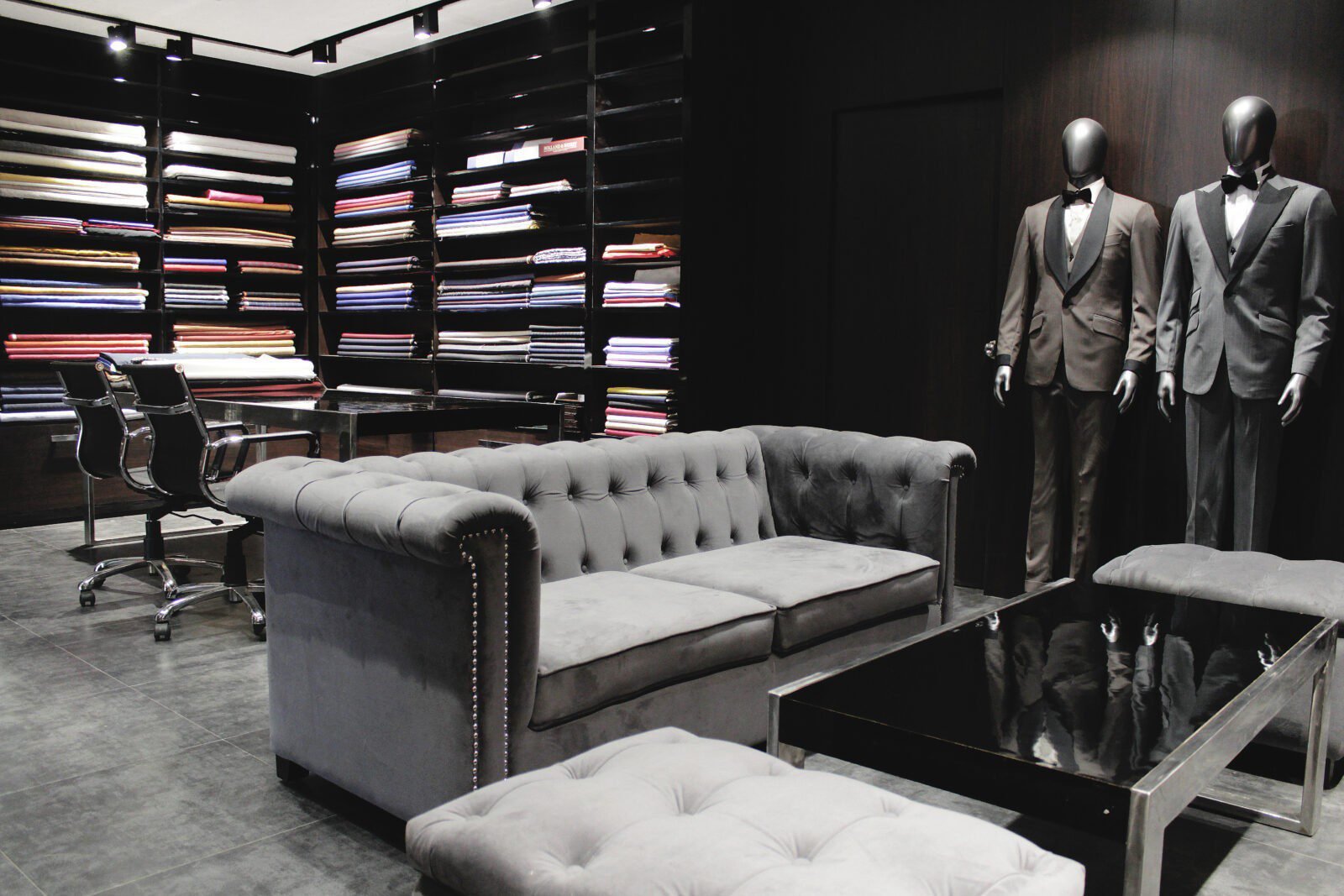 Kingsmen is a men’s fashion studio that embodies understated masculinity and refinement. The interiors, defined by dark walnut veneer and raw concrete flooring, create a bold yet minimal backdrop. A sleek steel strip conceals hangers with precision, while carefully planned lighting reveals the true richness of fabrics. The layout transitions from a display zone to a dedicated fabric area, where clients can unfold and experience suit materials in detail. A plush waiting area and refined changing rooms complete the space — making Kingsmen a study in modern tailoring, craftsmanship, and design discipline.