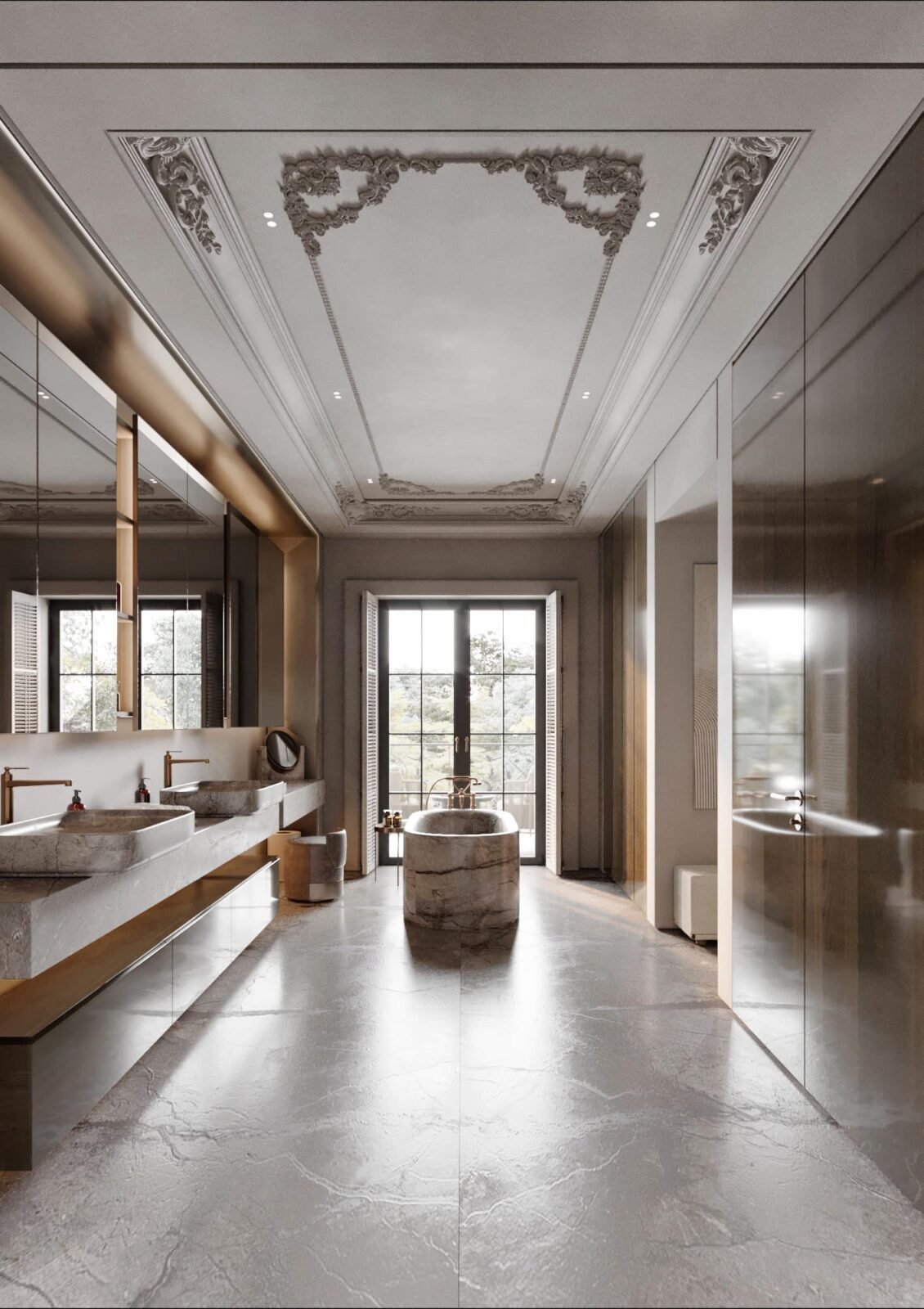 La Maison is a residence that captures the timeless charm of Parisian interiors through a modern lens. Subtle ceiling ornamentation, teak wall panelling with open grains, and patterned wooden flooring bring depth and texture to the space. The warm, neutral palette complements understated furniture, creating an atmosphere of effortless luxury. Thoughtfully planned and finely detailed, La Maison exudes a quiet sophistication — elegant, inviting, and timelessly refined.