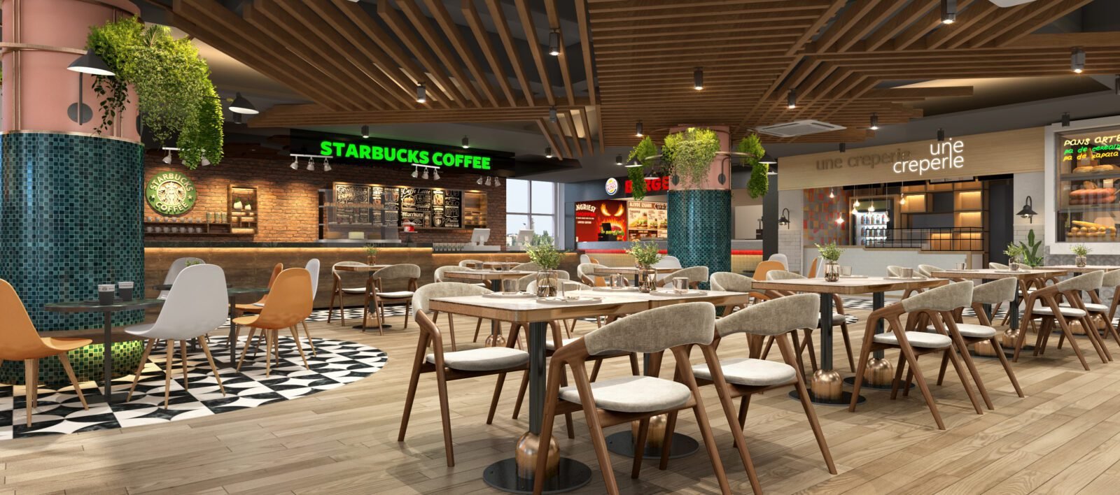 RCube Food Court at RCube Monad Mall, Noida, elevates the idea of communal dining into an immersive design experience. The layout integrates diverse spatial typologies—a banquet-style zone that mimics the intimacy of a restaurant, interactive seating clusters encircling tall trees and sculptural columns, and a dramatic double-height area defined by curvilinear seating and suspended lamps. Greenery acts as a dominant design element, softening the commercial environment with freshness and scale. A material palette of warm wood and monochrome flooring anchors the plan, while customized chandeliers and curated lighting create layers of visual intrigue. The result is a plush, contemporary social space where design shapes the atmosphere.